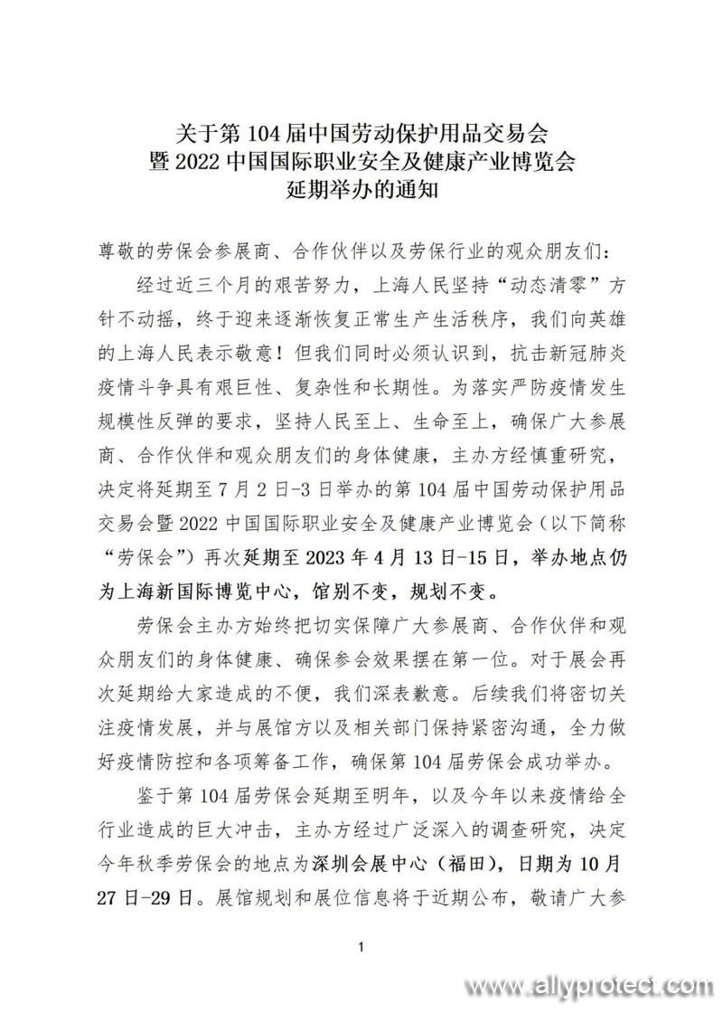 經(jīng)過近三個月的艱苦努力,上海人民堅(jiān)持“動態(tài)清零”方針不動搖,終于迎來逐漸恢復(fù)正常生產(chǎn)生活秩序,我們向英雄的上海人民表示敬意!但我們同時(shí)必須認(rèn)識到,抗擊新冠肺炎疫情斗爭具有艱巨性、復(fù)雜性和長期性。為落實(shí)嚴(yán)防疫情發(fā)生規(guī)模性反彈的要求,堅(jiān)持人民至上、生命至上,確保廣大參展商、合作伙伴和觀眾朋友們的身體健康,主辦方經(jīng)慎重研究,決定將延期至7月2日-3日舉辦的第104屆中國勞動保護(hù)用品交易會暨2022中國國際職業(yè)安全及健康產(chǎn)業(yè)博覽會(以下簡稱“勞保會”)再次延期至2023年4月13日-15日,舉辦地點(diǎn)仍為上海新國際博覽中心,館別不變,規(guī)劃不變。